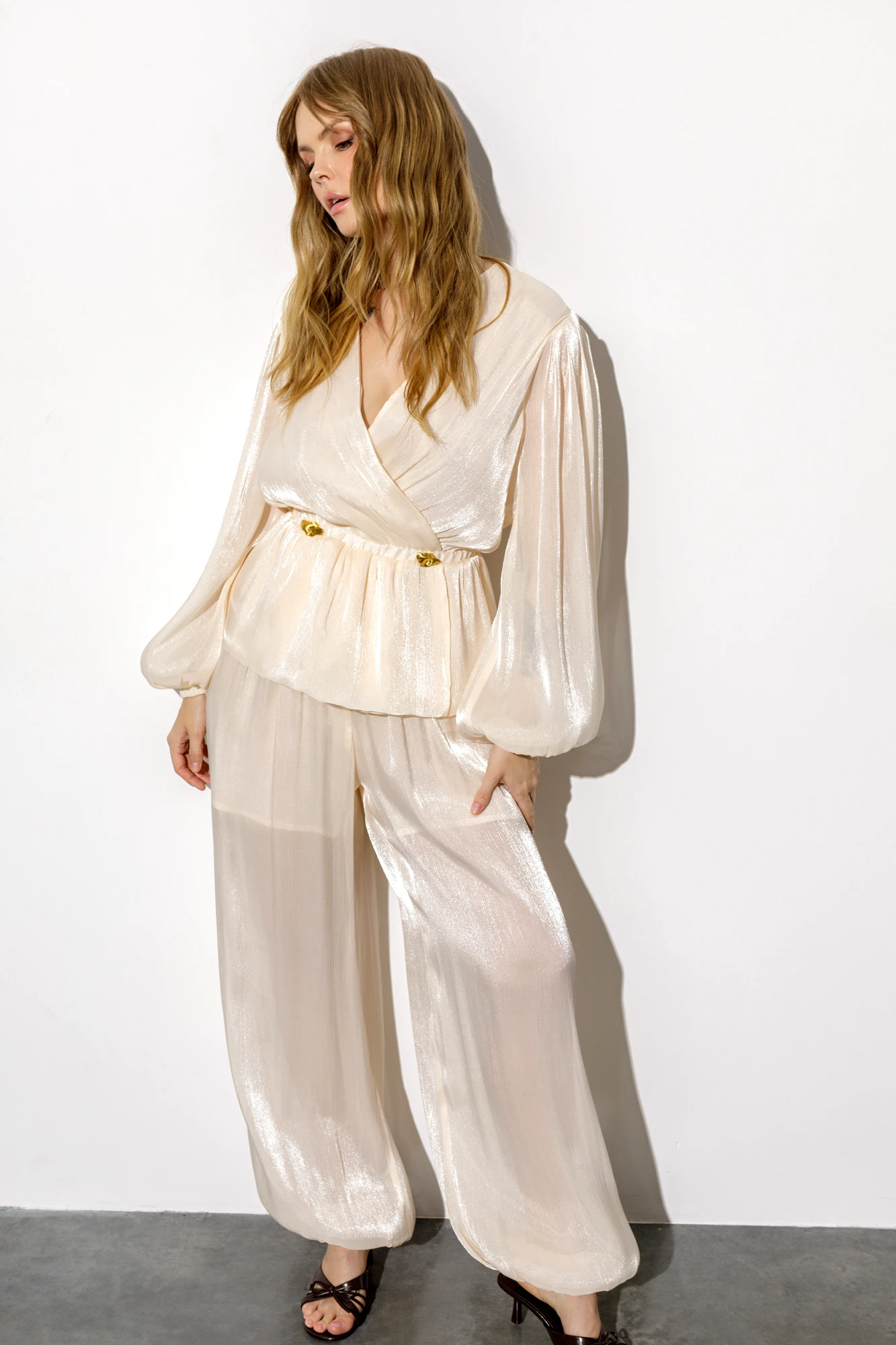 Широкие свободные брюки-алладины из фактурного шифона. Де...