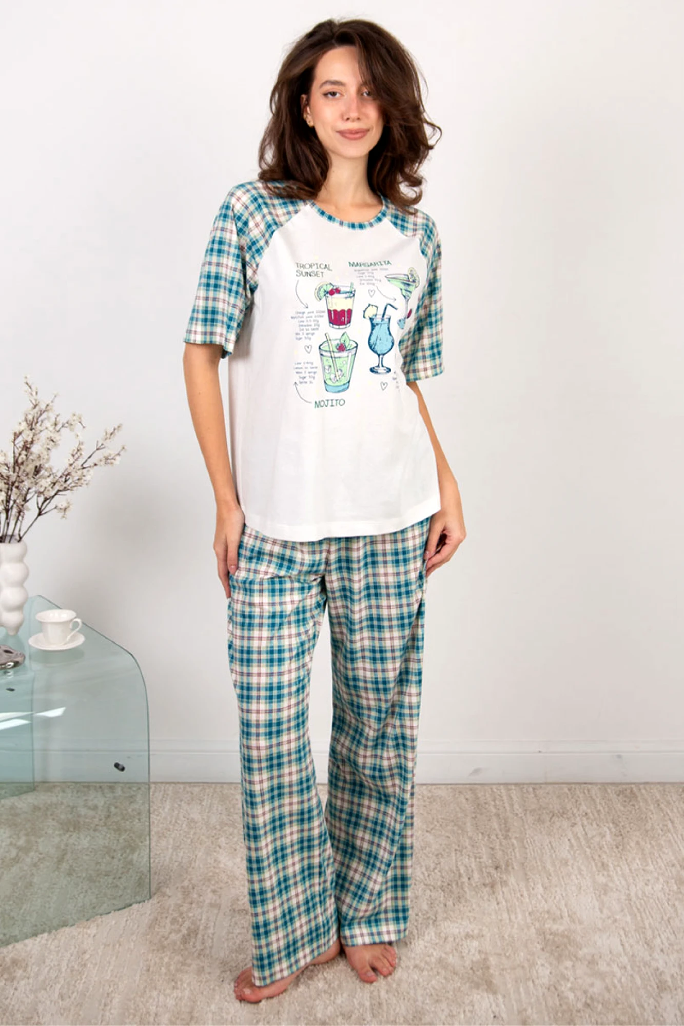 Пижама женкая в цвете экрю+ клетка из двух предметов