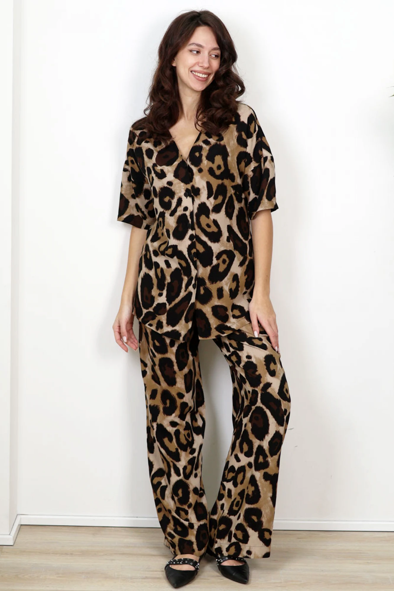 Костюм женский, с леопардовой набивкой.