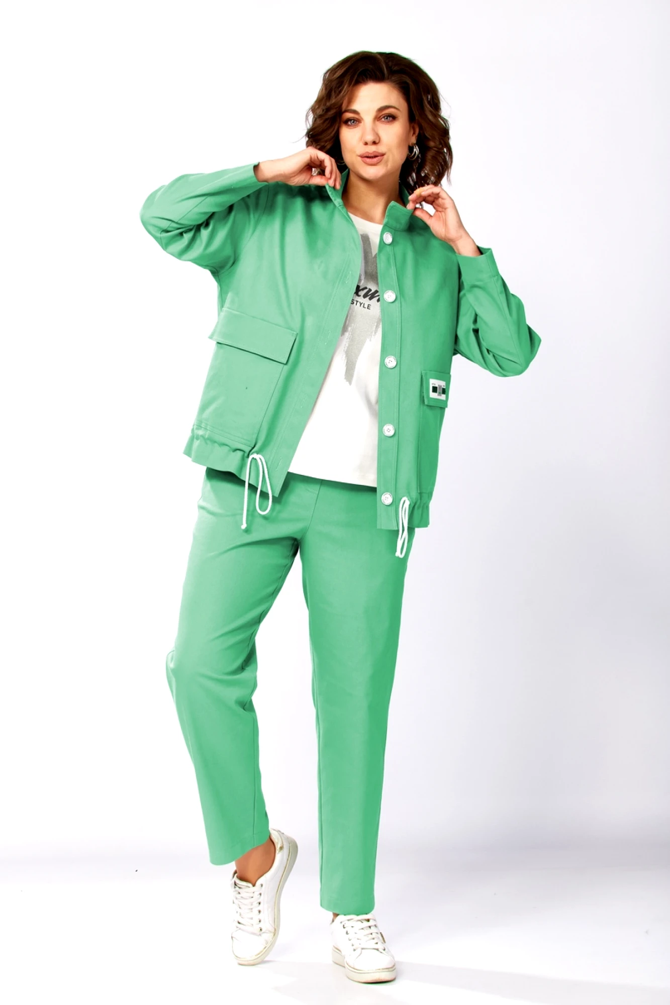 Бомбер + брюки: хлопок - 45%, полиэстер - 30%, вискоза - 25%. Майка: вискоза - 60%, полиэстер - 35%, спандекс - 5%.