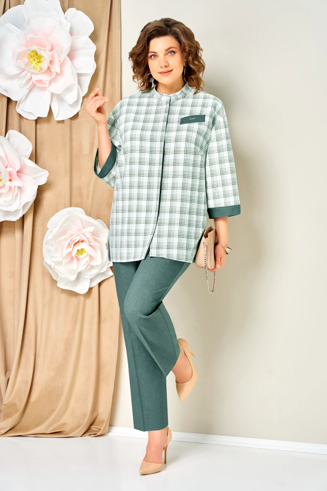 Жакет, брюки: полиэстер 51%, вискоза 46%, спандекс 3%. Блуза: полиэстер 95%, эластан 5%